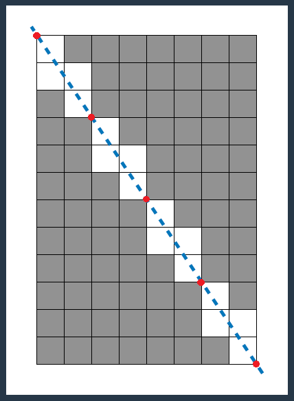 이 직선이 통과하는 정사각형의 개수는 W + H - GCD(W, H)로 8 + 12 - (GCD(8, 12) = 4)가 된다.
