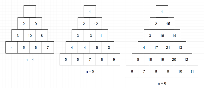 n = 4인 경우의 result = {1, 2, 9, 3, 10, 8, 4, 5, 6, 7} 이 된다.