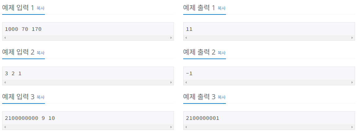첫 번째 줄에 손익분기점 즉 최초로 이익이 발생하는 판매량을 출력한다. 손익분기점이 존재하지 않으면 -1을 출력한다.