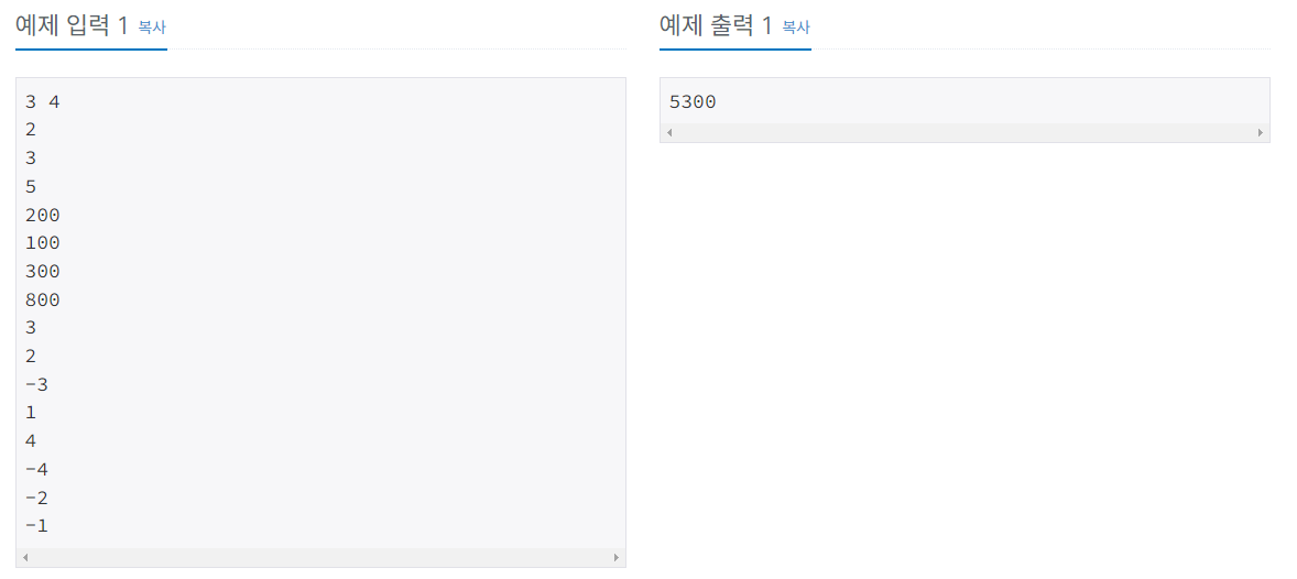 - 그 다음 N개의 줄에는 주차 공간들의 단위 무게당 요금을 나타내는 정수들이 주어진다. 그 중 s번째 줄에는 주차 공간 s의 단위 무게당 요금 Rs가 들어있다.