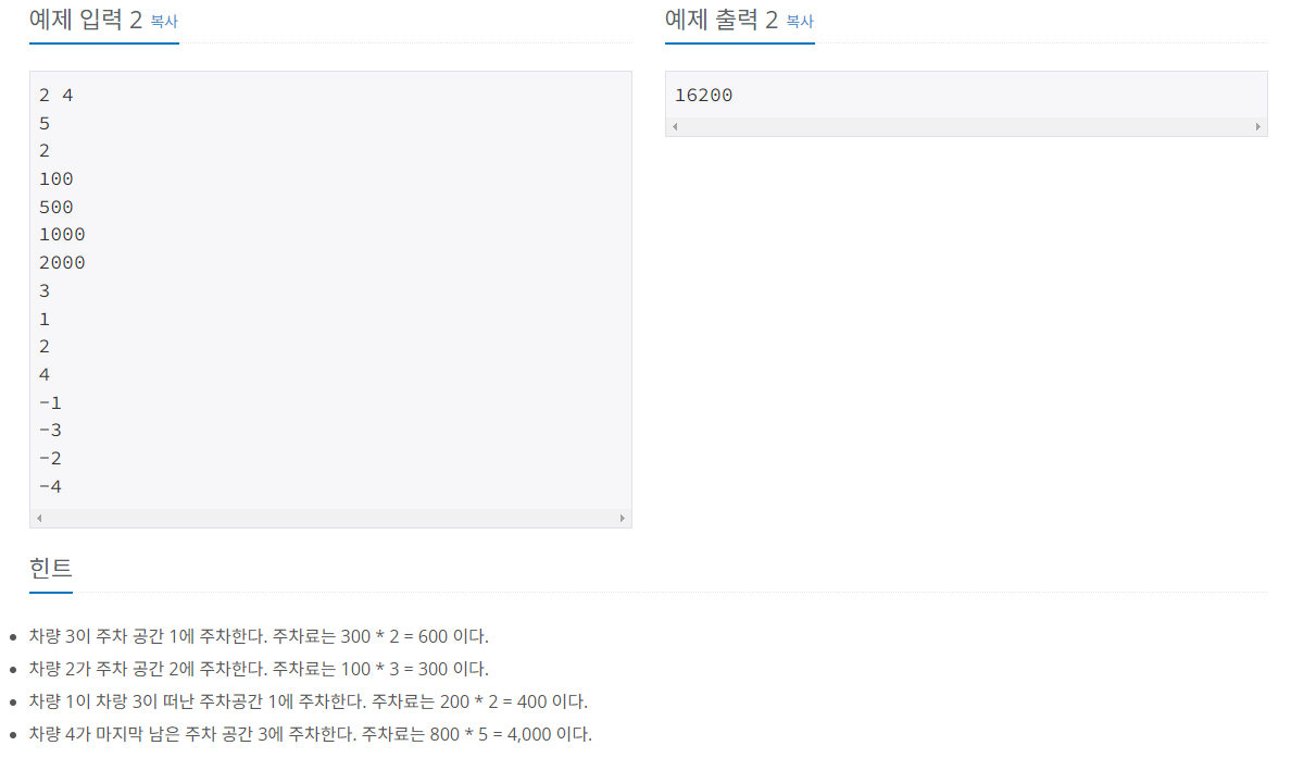 시내 주차장은 1부터 N까지 번호가 매겨진 N개의 주차 공간을 가지고 있다. 이 주차장은 매일 아침 모든 주차 공간이 비어 있는 상태에서 영업을 시작하며, 하룻동안 다음과 같은 방식으로 운영된다. 차가 주차장에 도착하면, 주차장 관리인이 비어있는 주차 공간이 있는지를 검사한다. 만일 비어있는 공간이 없으면, 차량을 빈 공간이 생길 때까지 입구에서 기다리게 한다. 만일 빈 주차 공간이 하나만 있거나 또는 빈 주차 공간이 없다가 한 대의 차량이 주차장을 떠나면 곧바로 그 장소에 주차를 하게 한다. 만일 빈 주차 공간이 여러 곳이 있으면, 그 중 번호가 가장 작은 주차 공간에 주차하도록 한다. 만일 주차장에 여러 대의 차량이 도착하면, 일단 도착한 순서대로 입구의 대기장소에서 줄을 서서 기다려야 한다. 대기장소는 큐(queue)와 같이, 먼저 대기한 차량부터 주차한다.