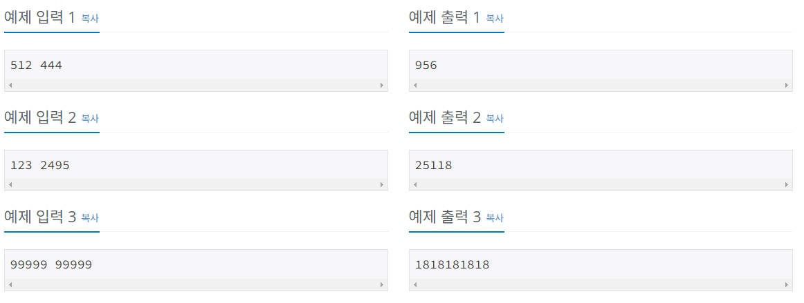 두 정수 A, B가 공백을 두고 주어진다. A와 B는 1과 1,000,000 사이의 정수이다.